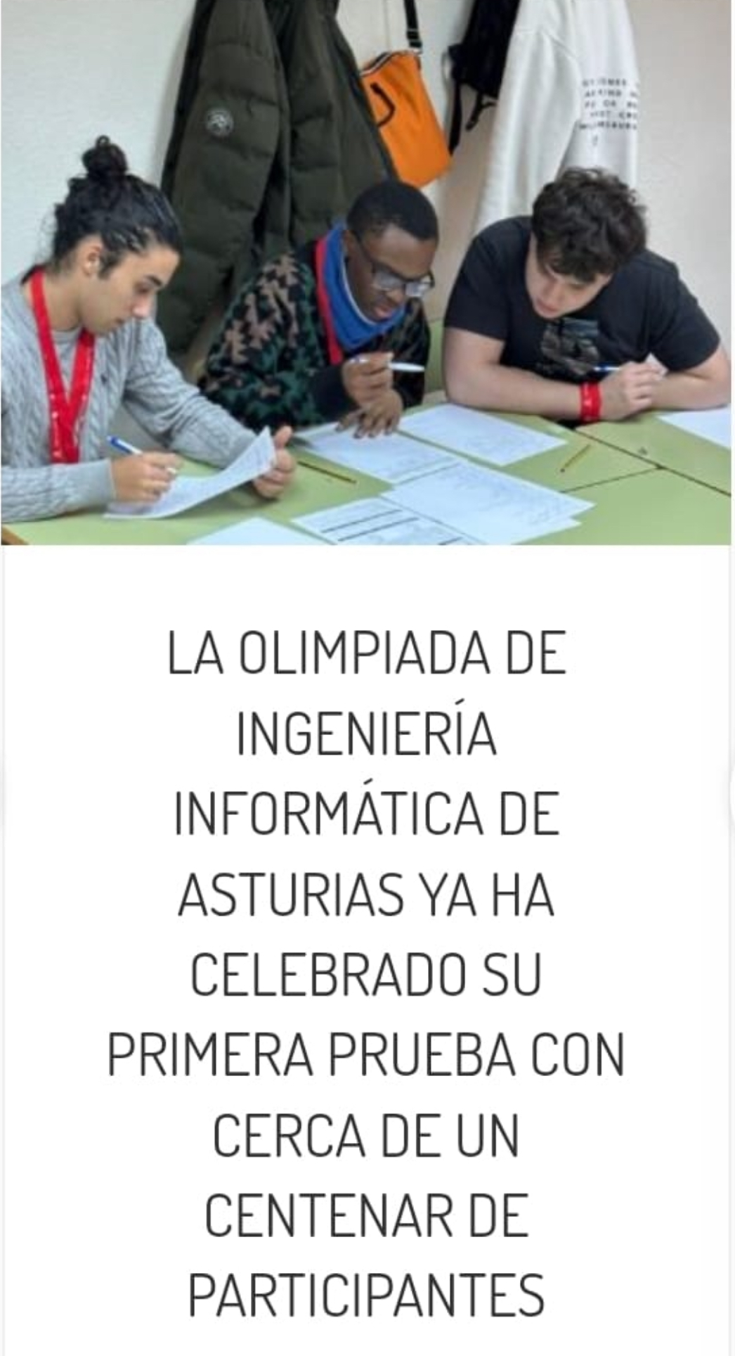 El pasado sábado 14 de Marzo, los alumnos Samuel Álvarez Cuervo, Ramiro Noriega González e Israel Eyene Ayingono participaron en la Olimpiada Informática de Asturias organizada por los Colegios Oficiales de Ingenieros e Ingenieros Técnicos en Informática del Principado de Asturias, la Escuela de Ingeniería Informática y la Escuela Politécnica de Ingeniería de la Universidad de Oviedo. Es una actividad dirigida a alumnado de educación secundaria, bachillerato y formación profesional o ciclos formativos, radicados en Asturias, cuyo principal objetivo es fomentar el interés por la informática y el conocimiento de los posibles estudios dentro de este campo.